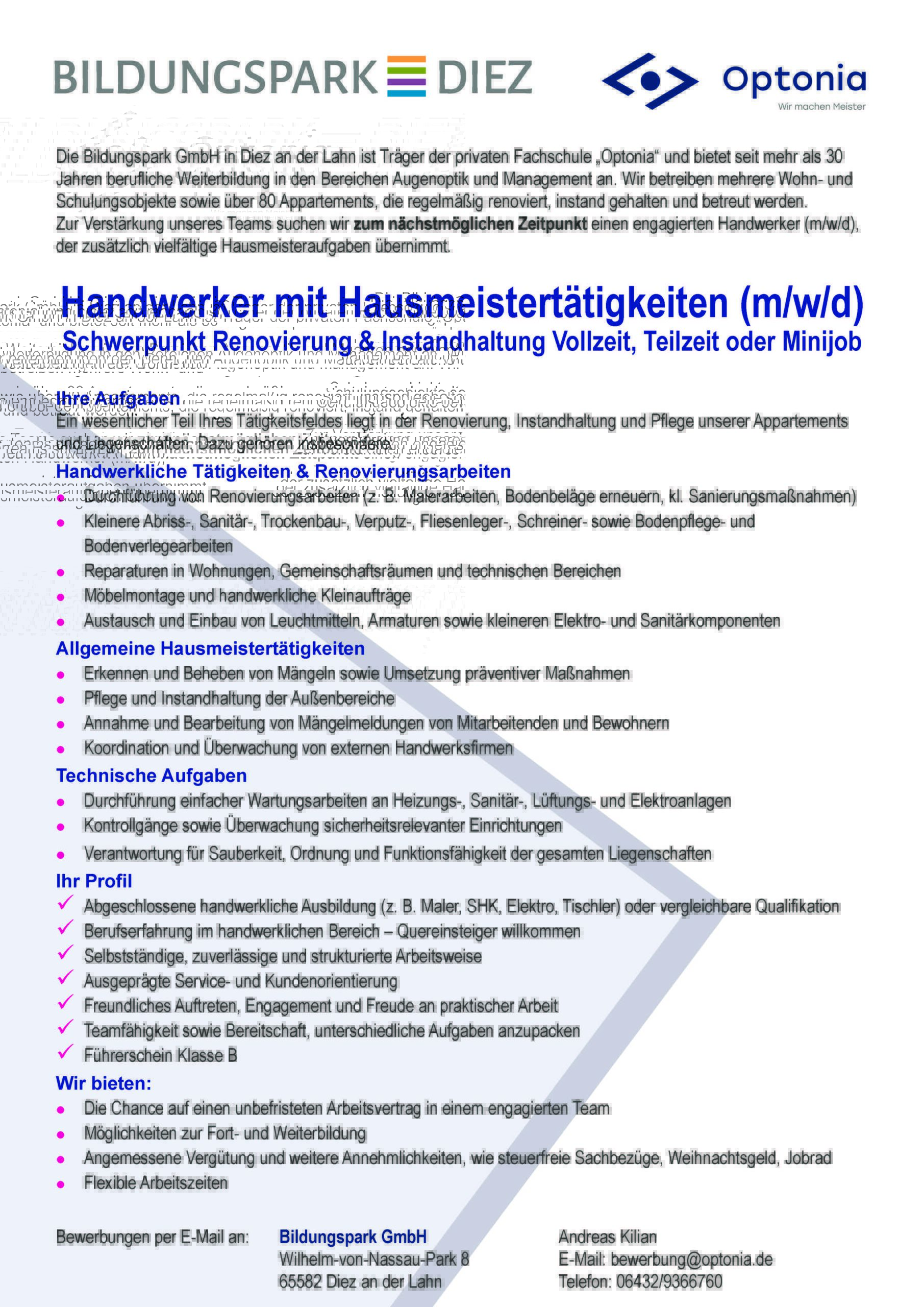 Zur Verstärkung unseres Teams an unserem Standort in Diez suchen wir zum nächstmöglichen Zeitpunkt einen engagierten Handwerker (m/w/d), der zusätzlich vielfältige Hausmeisteraufgaben übernimmt.